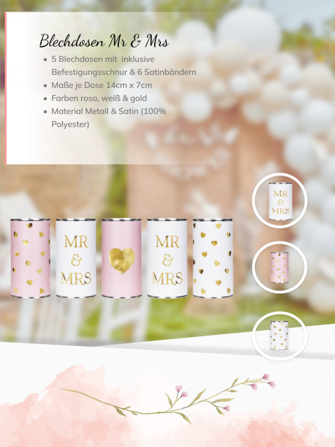 Verleihe dem Brautauto einen charmanten und klassischen Touch mit diesen wunderschönen Blechdosen. Das Set umfasst fünf liebevoll gestaltete Blechdosen: eine Dose in Rosa mit goldenem Herz, zwei Dosen in Weiß mit dem goldenen Schriftzug "Mr & Mrs", eine weiße Dose mit goldenen Herzen und eine weitere rosa Dose mit goldenen Herzen. Die Dosen werden mit einer praktischen Befestigungsschnur und sechs eleganten Satinbändern geliefert, sodass du sie mühelos anbringen kannst.