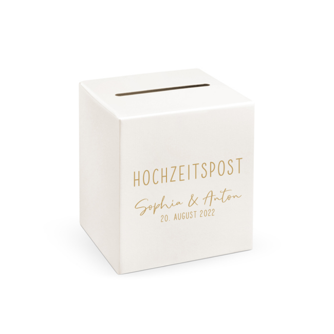 Passend für deine Hochzeit kannst du die personalisierte Briefbox für Geldkuverts und Glückwunschkarten verwenden. Die Briefbox kann beschriftet werden nur mit dem Schriftzug Hochzeitspost oder mit Hochzeitspost plus Brautpaarname und Hochzeitstag. Als Schriftfarbe kann Gold oder Schwarz ausgewählt werden. Wir behalten uns freie Gestaltung beim Setzen der Namen vor. Je nach Länge der Vornamen macht es Sinn, die Namen auf zwei Zeilen zu verteilen.
