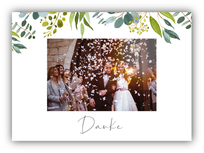 Gestalte die Dankeskarte ganz nach deinem Geschmack, indem du ein Bild von deiner Hochzeitsfeier in hoher Qualität (300 dpi) bereitstellst und einen kurzen, herzlichen Dankesgruß für deine Gäste verfasst. Diese individuelle Note macht die Dankeskarte zu einem ganz persönlichen Dankeschön, das deine Gäste sicherlich zu schätzen wissen.