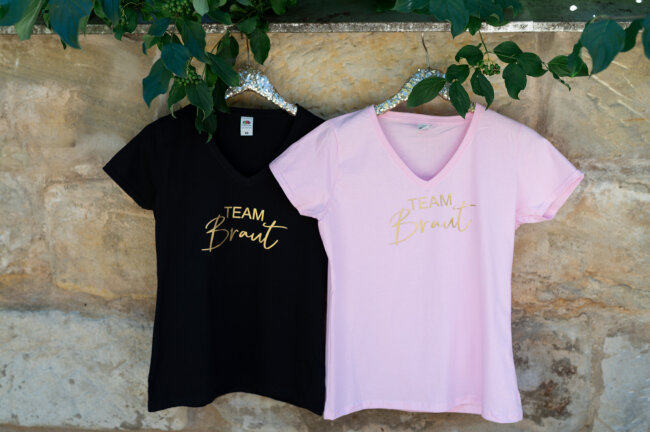 Was wäre ein Junggesellinnenabschied ohne das passende Outfit? Mit unserem JGA T-Shirt "TEAM BRAUT" von Miss Lovely® bist du optimal gekleidet für den Partyabend mit deinen Freundinnen. Dieses T-Shirt kannst du in der Farbe schwarz, grau oder rosa bestellen. Besonders hübsch ist der Signature Schriftzug TEAM BRAUT in Gold. Das T-Shirt mit seinem taillierten Schnitt und dem etwas tieferen V-Ausschnitt ist feminin geschnitten und macht eine gute Figur.