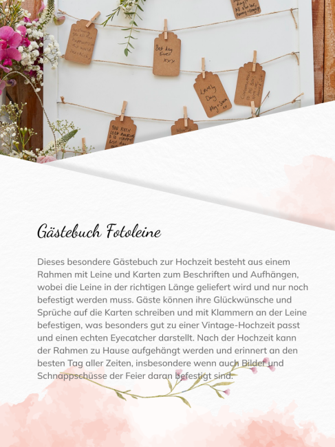 Ein besonderes Gästebuch zur Hochzeit ist dieser Rahmen mit Leine und Karten zum Beschriften und Aufhängen. Die Leine muss noch im Rahmen festgebunden werden, wird aber bereits in der richtigen Länge geliefert. Das Gästebuch ist wirklich etwas besonderes und ist ein Eyecatcher auf deiner Hochzeit im Vintage Stil. Auf den Karten können die Gäste ihre Glückwünsche und Sprüche schreiben und mit einer Klammer auf der Leine befestigen. Besonders hübsch ist es auch, wenn die Gäste Bilder und Schnappschüsse von der Hochzeit an der Leine befestigen. Nach der Hochzeit kann der Rahmen zu Hause aufgehängt werden und erinnert im an den BEST DAY EVER.